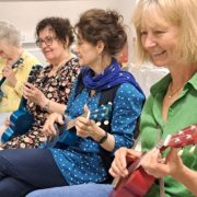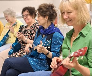 Photo caption: Volunteers and staff in the schoolroom at Saffron Walden Museum for their annual celebration tea party. The museum’s new Community Engagement Officer, Michael Davidson ran a ukelele lesson which was a great ice breaker.