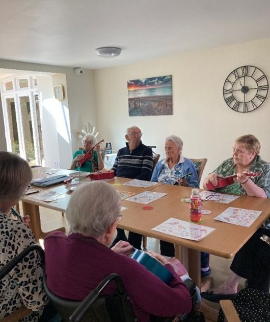 Musical Memories uses informal musical participation to prompt reminiscences. Residents enjoyed learning ukulele chords to accompany themselves singing their favourite songs. These ranged from ukulele classic ‘Leaning on a Lampost’ through Rod Stewart’s version of ‘Sailing’, a table-thumping rendition of ‘The Wild Rover’ before rocking out to Status Quo’s version of ‘Rocking All Over the World’.